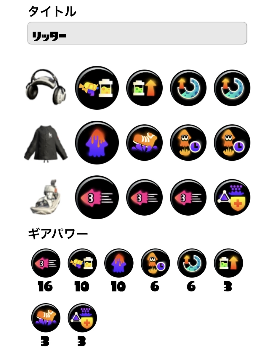 前線で戦いたいからゾンビステジャン、スペシャル回すからスぺ増みたいな大まかなところから、サブ軽減のギアパワーの個数一つとってもその人がどのラインで戦いたいかが見えて素敵